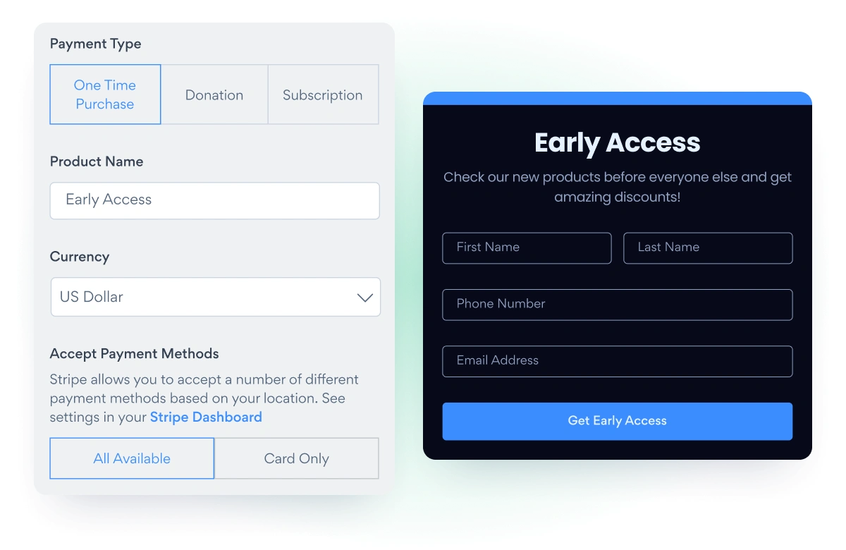 To set up payments on your contact form, toggle 'Require Payment' in the POWR Editor, enter your payment account details (PayPal or Stripe) and choose your desired payment type. You can also customize confirmation emails and receipts that customers receive after submitting their inquiry with payment.