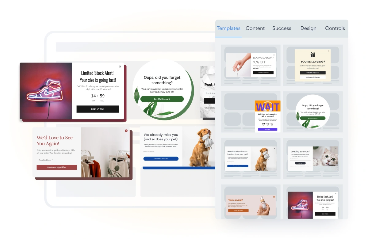 Start with pre-built templates designed for specific goals—email collection, flash sales, cart abandonment recovery, and more.