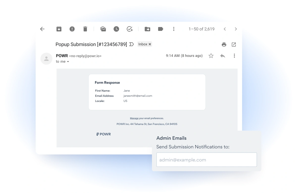 Reduce response time to leads by 74% with instant submission notifications anytime someone completes your popup.