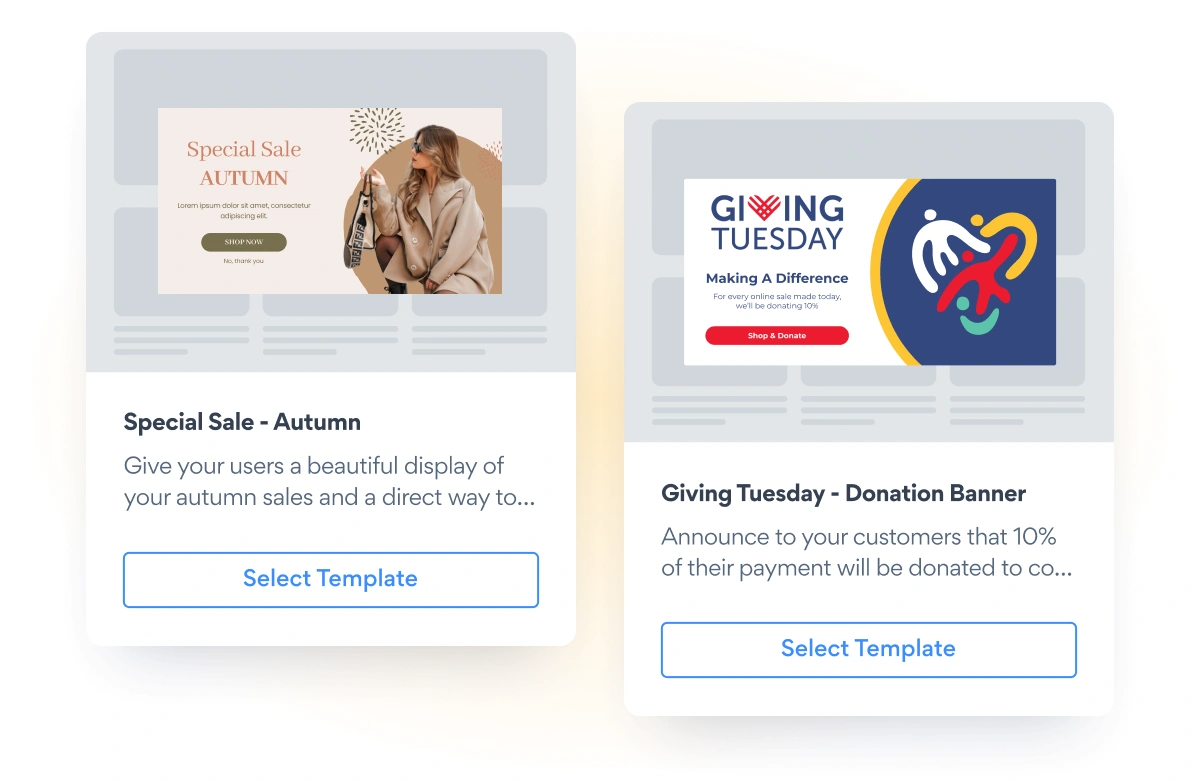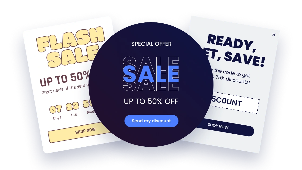 Start with pre-built templates designed for specific goals—email collection, flash sales, cart abandonment recovery, and more.