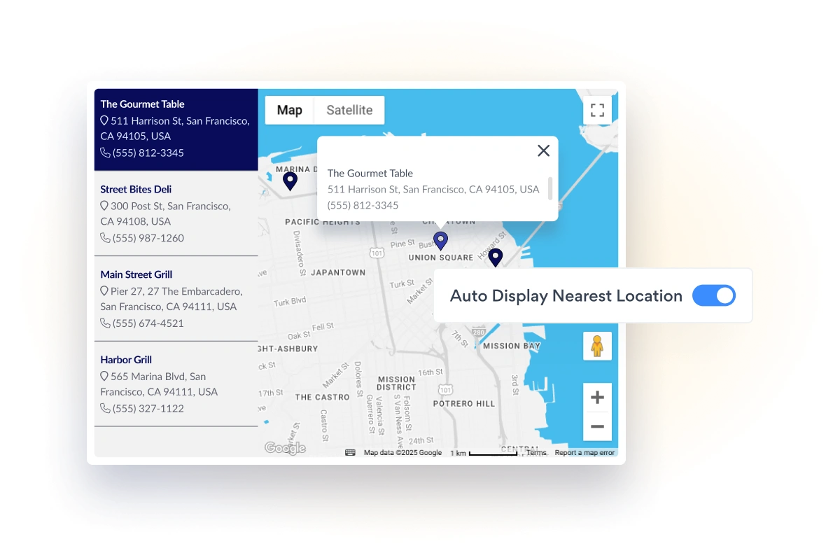 POWR Map app will automatically show site visitors your nearest location or allow them to jump to other store locations.