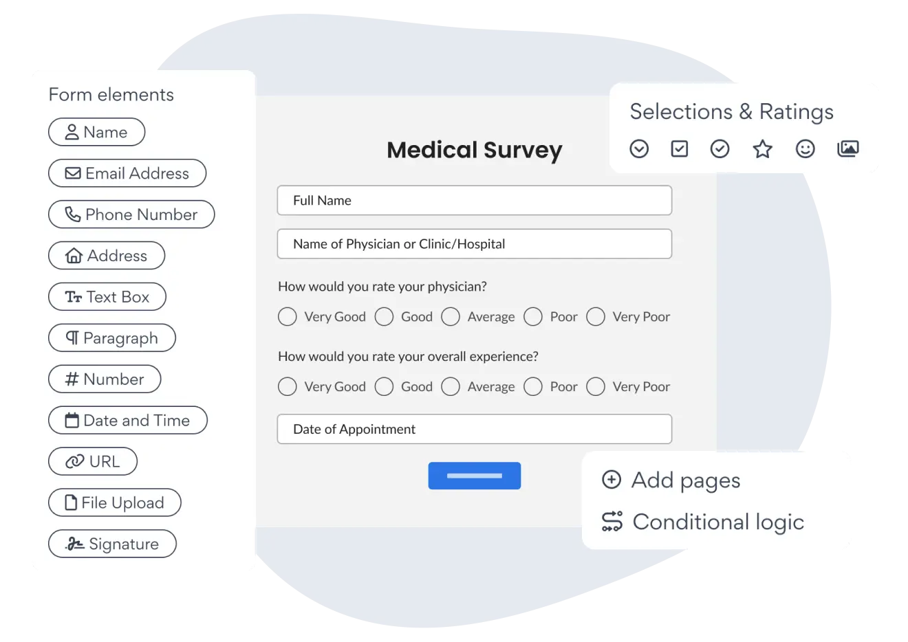 Choose dropdowns, multiple-choice, star ratings, file uploads, emoji feedback, picture choice, and more.