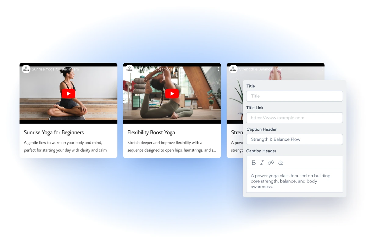 Showcase videos from your YouTube or Vimeo accounts. Change title images, captions, descriptions, and filters, add links and alt text. If you can think it, you can do it.